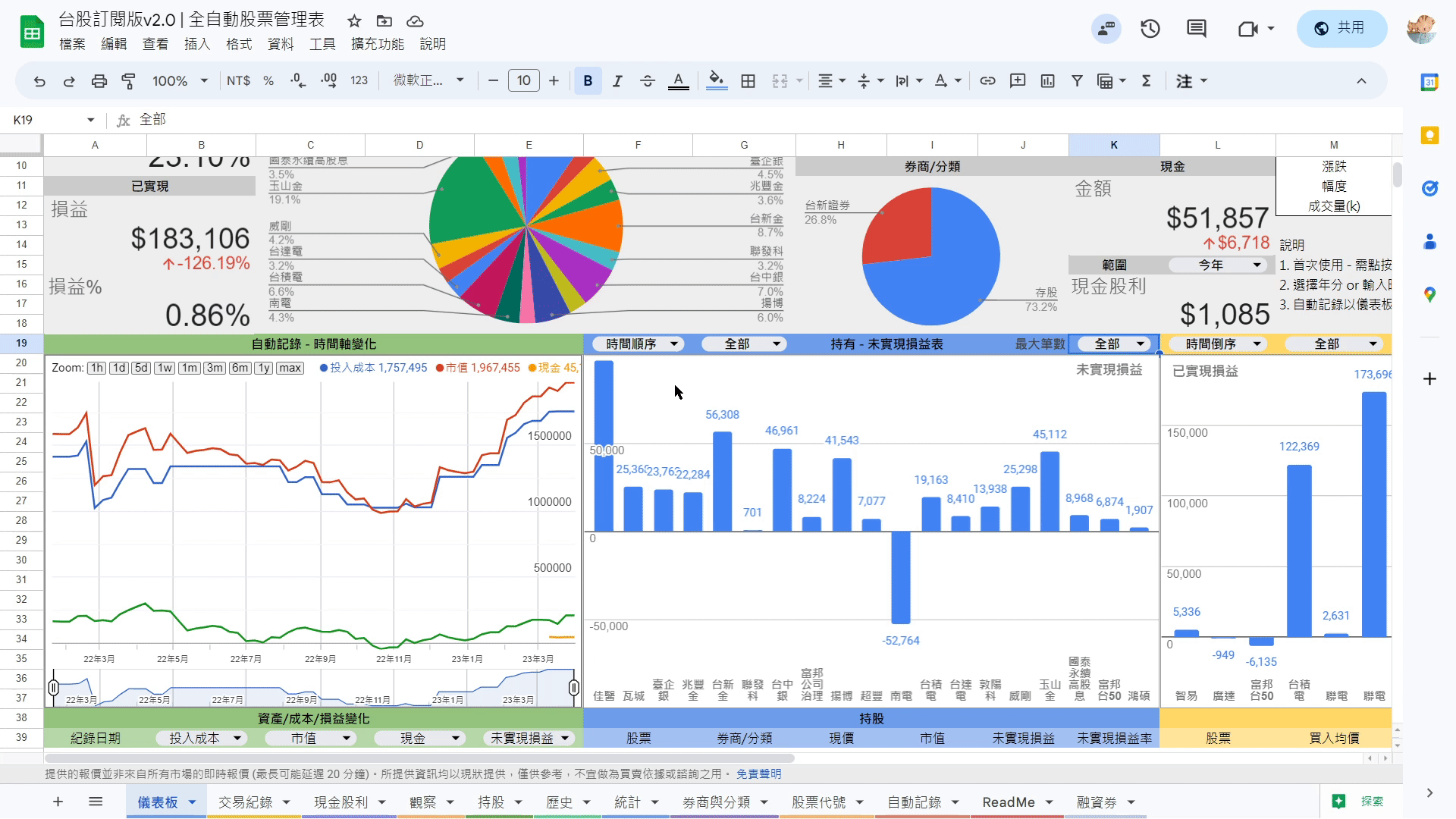 • 市值、投入成本、損益(%)、差異比較(上升or下降)